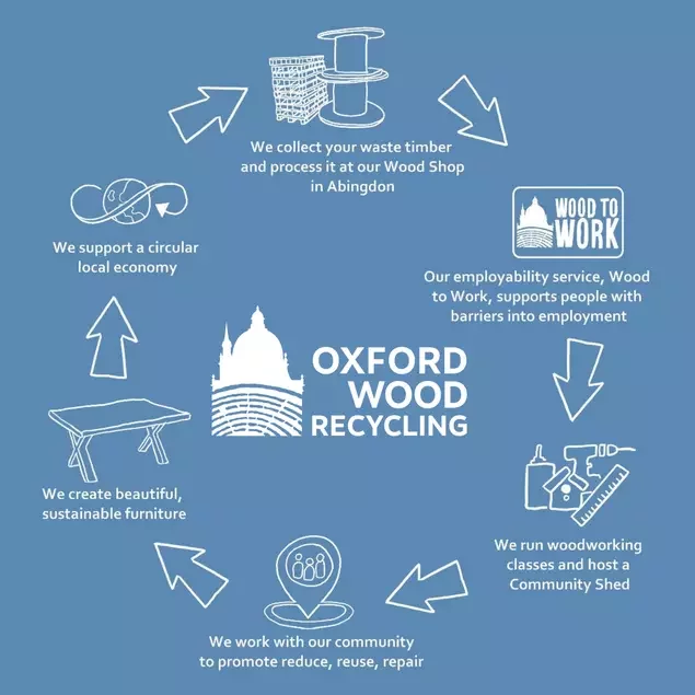 We choose to support and partner with Oxford Wood Recycling for all of our wood waste collections. They are a local charity and social enterprise that collects wood waste across Oxfordshire, then sorts it so as much as possible stays in use. They are not only about waste reduction. They are also focused on creating routes into work for people who face barriers to employment.